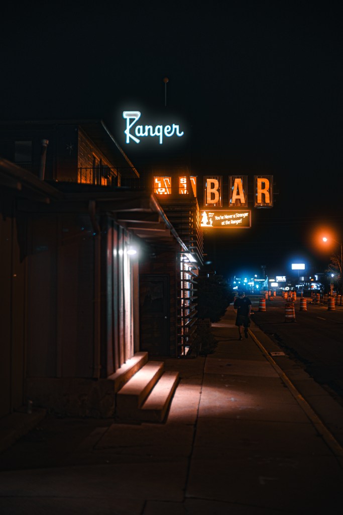 This was directly across the street from the fly shop I just didn’t think there was anything really interesting about the picture. That or I just didn’t know how to frame it. It doesn’t hurt my feelings to have a picture come out bad it’s going to happen. I can’t overthink it. I always did the best on tests when I just sped through and answered the questions and didn’t second guess them. I think I will stick with that mantra with my photography. It’s digital I can just delete it later. After spending a few minutes getting these in West Laramie I headed into town to the main drag. Once again I had no plan just cruised around a bit to let the dogs smell until I spotted something. I had been to the Ranger bar there in town a time or two but that was it. I noticed the hotel / bar sign lit up and figured I should take a stab at catching something there.